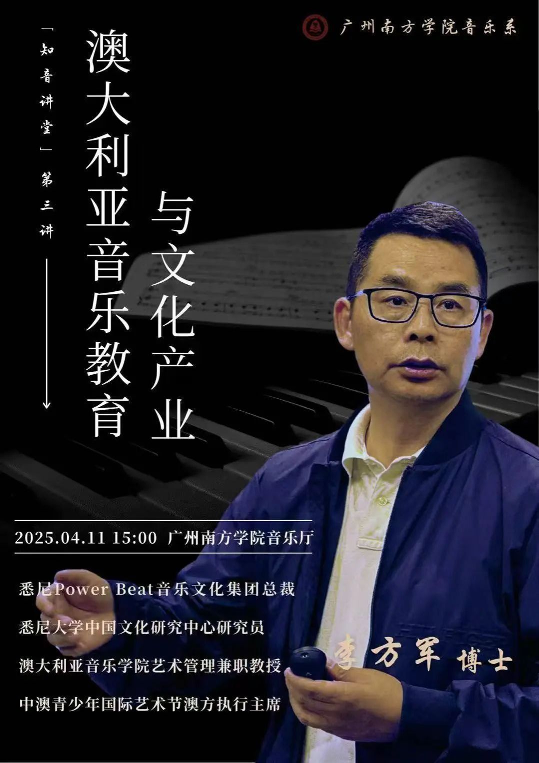 “知音讲堂”第三讲,特邀悉尼Power Beat音乐文化集团总裁、悉尼大学中国文化研究中心研究员、悉尼麦考瑞大学兼职教授李方军博士做客广州南方学院音乐系,讲授《澳大利亚音乐教育与文化产业》专题讲座。